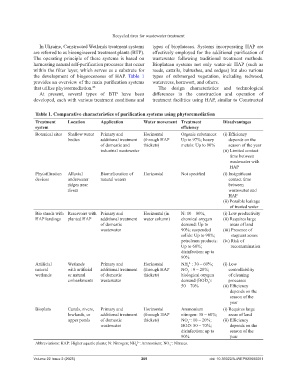 Table 1. Comparative characteristics of purification systems using phytoremediation
