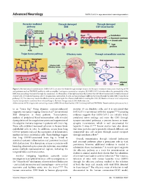 Figure 2. Mechanisms of neuroinvasion. SARS-CoV-2 can enter the brain through multiple routes: (A) Receptor-mediated endocytosis involving ACE2