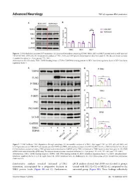 Figure 5. TDP43 facilitates TBK1 degradation through autophagy. (A) Immunoblot analysis of p-TBK1, Myc-tagged TBK1, p-IRF3, p62, p62-S403, and
