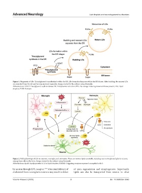 Figure 2. Pathophysiology of LDs in neurons, microglia, and astrocytes. There are various lipids crosstalk, including neuron-to-glia and glia-to-neuron,