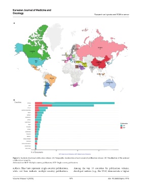 authors. Blue bars represent single-country publications, Among the top 10 countries by publication volume,