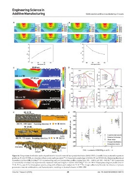Figure 16. Temperature distribution and melt pool behavior in multi-material laser powder bed fusion (MM-LPBF). (A and B) Cross-sectional temperature