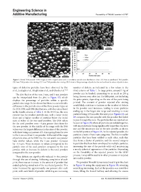 of particle sizes, at the D90 line, the new and 3-use powder particles that have been welded to each other, such that