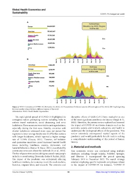 Figure 2. WHO Coronavirus (COVID-19) (November 25, 2022). (A) Presentation of infected cases in different regions of the world. (B) Graph depicting