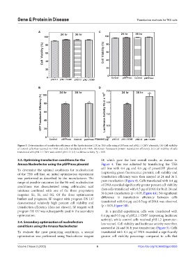 of control cells that received no DNA and cells transfected with DNA. (B) Green fluorescent protein transfection efficiency. (C) Cell viability of cells