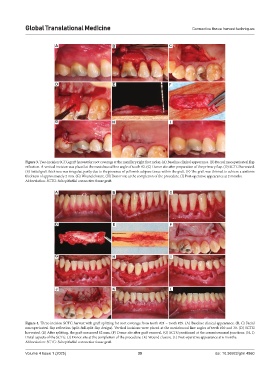 harvested. (E) After splitting, the graft measured 62 mm. (F) Donor site after graft removal. (G) SCTG positioned at the cementoenamel junctions. (H, I)