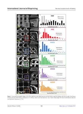 between two pins of the 3D box corresponds to 5 to 500 µm; yellow scale bar represents 1 mm. The bar charts depict the data of wall thickness and pore