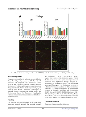 Figure 8. Results of preliminary biological studies based on MTT, LDH, and Live/Dead tests at (A) 2 days and (B) 6 days. Scale bar: 800 µm.
