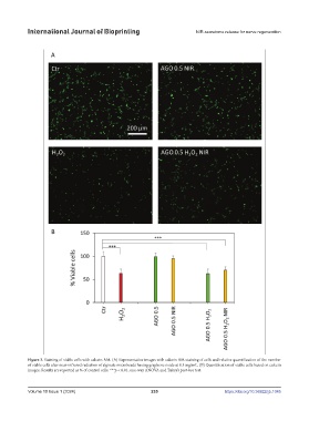of viable cells after near-infrared radiation of alginate microbeads having graphene oxide at 0.5 mg/mL. (B) Quantification of viable cells based on calcein