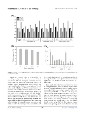 Figure 4. Printability of the ink depending on printing conditions: (A) width, length, height, and volume of the constructs, (B) thickness expansion, and