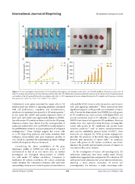 Figure 5. In vivo tumorigenic characteristics of 3D-bioprinted meningioma microtissue in nude mice. (A) Growth condition of tumors in nude mice of