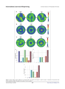Figure 3. Textures within swaged workpieces via pole figures (PF): (A) sample 20, (B) sample 17, and (C) sample 15. Intensities of characteristic ideal