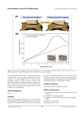 Figure 11. (A) Geometries of implant–vertebra (Female L4) interfaces of commercial and patient-specific implants. (B) Load–displacement curves of
