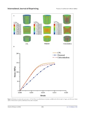 Figure 5. Mechanical compression test results. (A) Von Mises stress distribution of porous scaffolds with different unit cell types, and (B) stress–strain
