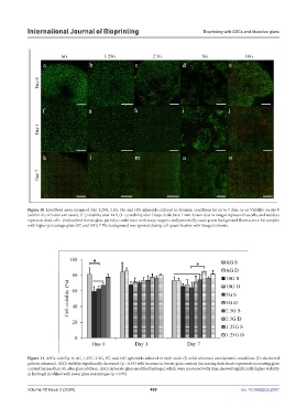 Figure 10. Live/Dead assay images of AG, 1.25G, 2.5G, 5G, and 10G spheroids cultured in dynamic conditions for up to 7 days. (a–e) Viability on day 0