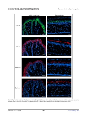 Figure 6. Representative staining of healthy human skin and bioprinted skin equivalents (at day 35). Healthy human skin and skin equivalents were stained