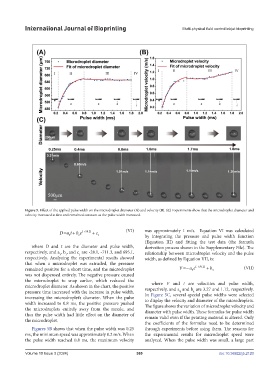 Figure 5. Effect of the applied pulse width on the microdroplet diameter (A) and velocity (B). (C) Experiments show that the microdroplet diameter and