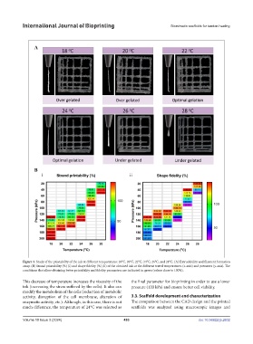 assay. (B) Strand printability (%) (i) and shape fidelity (%) (ii) of the obtained ink at the different tested temperatures (x-axis) and pressures (y-axis). The
