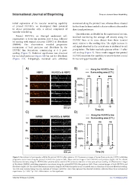 progressive recruitment along the printed HUVECs line patterns (left). Phase-contrast images of both HUVECs and pericytes (right). (B) The relative
