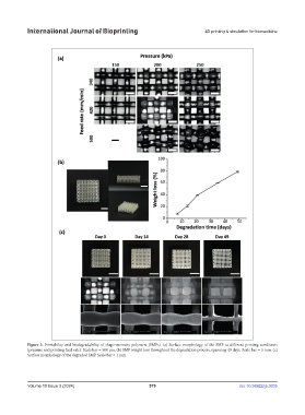 (pressure and printing feed rate). Scale bar = 500 μm. (b) SMP weight loss throughout the degradation process, spanning 49 days. Scale bar = 3 mm. (c)