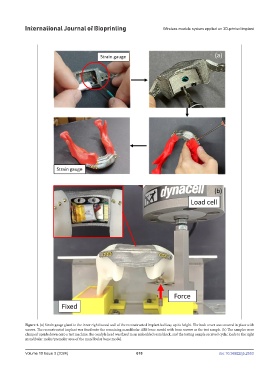 Figure 4. (a) Strain gauge glued to the inner right buccal wall of the reconstructed implant halfway up its height. The back cover was secured in place with