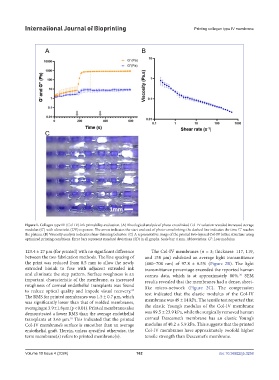 the plateau. (B) Viscosity analysis indicates shear-thinning behavior. (C) A representative image of the printed two-layered Col-IV lattice structure using