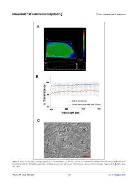 Figure 2. Physical evaluation of collagen type IV (Col-IV) membrane. (A) The 3D confocal test demonstrates uniform surface coloring. (B) Both Col-IV