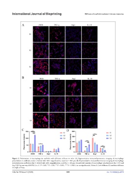 polarization in scaffolds at day 1; viewed with 400× magnification; scale bar = 100 μm. (B) Representative immunofluorescence imaging of macrophage