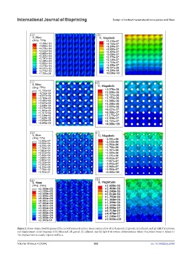 and displacement cloud diagrams of (b) diamond, (d) gyroid, (f) Lidinoid, and (h) Split P structures. Abbreviations: Mises: Von Mises Stress; S: Mises; U: