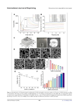 Figure 2. Characterization of 3D-bioprinted gelatin methacryloyl (GelMA) hydrogels for soft culture system. (A) Viscosity of GelMA hydrogels according