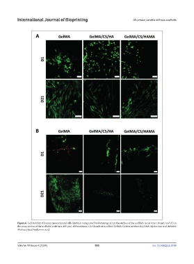 Figure 6. Cell viability of human mesenchymal cells (hMSCs) using Live/Dead staining (A) on the surface of the scaffolds (scale bars: 100 µm) and (B) in
