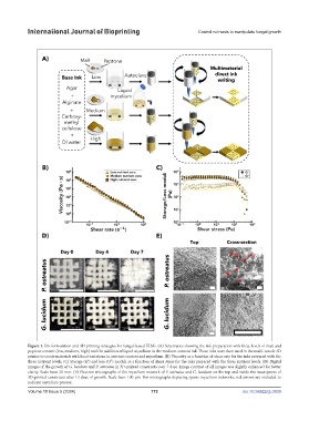 peptone content (low, medium, high) and the addition of liquid mycelium in the medium-content ink. These inks were then used in the multi-nozzle 3D