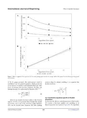 Figure 7. Effect of ingredient flow speed on (A) the actual printing speed and (B) the average width of the printed line for different printing speeds