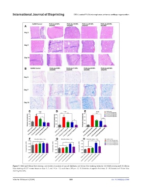 blue staining of C57 mouse tissue on days 3, 7, and 14 (n = 5); scale bars: 200 µm. (C–E) Statistics of capsule thickness. (F–H) Statistics of Alcian blue