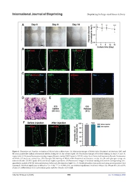 stained red violet. (E) ICG uptake (left) and release (right) experiments. (F) Fluorescence images of live/dead staining (left) and the corresponding semi-