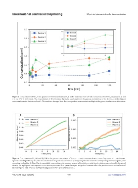Figure 3. Concentration of O (A) and N O (B) in the gaseous environment of devices 1, 2, and 3, measured over 15 min of operation in a closed reactor.