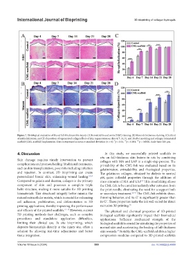 of epithelialization, and (D) deposition of regenerated collagen fibers of skin regeneration on days 4, 7, 14, 21, and 28 after modeling and collagen biomaterial
