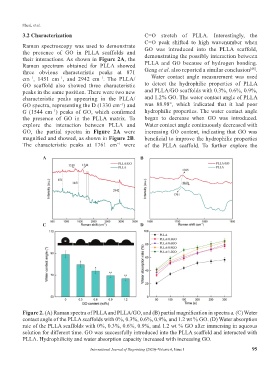 Figure 2. (A) Raman spectra of PLLA and PLLA/GO, and (B) partial magnification in spectra a. (C) Water