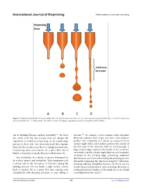 Figure 1. Filament extrudability: (A) unextrudable (We ≈ 0), (B) discontinuous (We << 1) , (C) continuous yet uncontrollable (We < 1), and (D) continuous