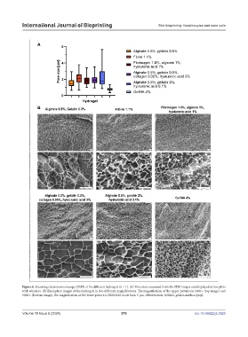 with whiskers. (B) Exemplary images of the hydrogels in two different magnifications. The magnification of the upper pictures is 1000 (top image) and