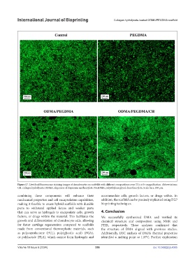 Figure 17. Live/dead fluorescence staining images of chondrocytes on scaffolds with different compositions over 72 h at 5× magnification. Abbreviations: