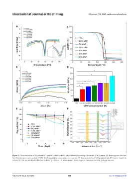from thermal gravimetric analysis (TGA). (C) Representative stress versus strain curves. (D) Young’s modulus. (E) Degradation test. (F) Fourier-transform