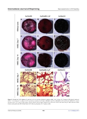 Figure 8. Alizarin Red (AR) staining of constructs and cryo-sections of printed constructs after 7 and 14 days. (A–I) Images of AR-stained constructs