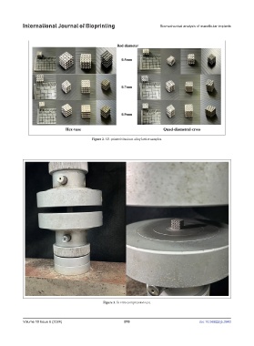 International Journal of Bioprinting Biomechanical analysis of mandibular implants Figure 2. 3D-printed titanium alloy lattice samples. Figure 3. In vitro compression test. Volume 10 Issue 6 (2024) 570 doi: 10.36922/ijb.3943