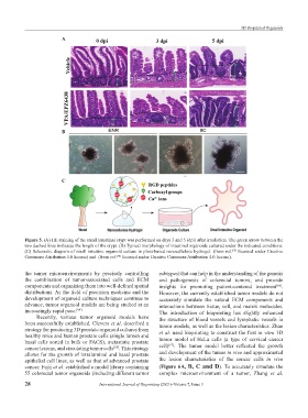 Figure 5. (A) HE staining of the small intestinal crypt was performed on days 3 and 5 (dpi) after irradiation. The green arrow between the