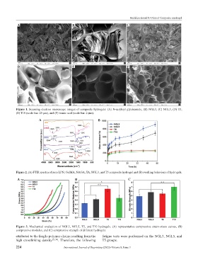 Figure 2. (A) FTIR spectra of pure LPN, GelMA, NAGA, TA, NGL3, and T5 composite hydrogel and (B) swelling behaviors of hydrogels.