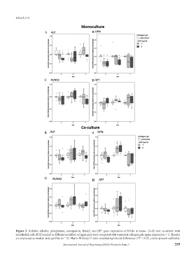 Figure 2. Relative alkaline phosphatase, osteopontin, Runx2, and SP7 gene expression of hOBs in mono- (A-D) and co-culture with
