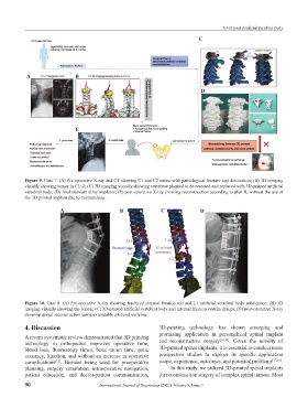 imaging visually showing the lesion; (C) 3D-printed artificial vertebral body and internal fixation system design; (D) post-operative X-ray