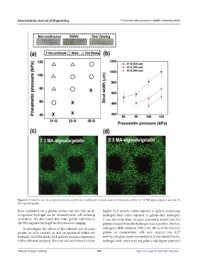 Figure 8. Printability test by (a) pressure/nozzle and (b) strut width and live/dead assay on fabricated scaffold: (c) 7:3 MA-alginate/gelatin and (d) 5:5