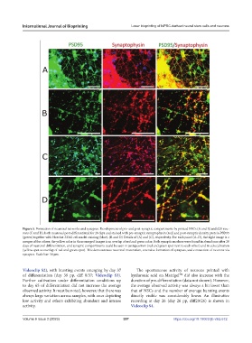 Figure 5. Formation of neuronal networks and synapses. Development of pre- and post-synaptic compartments by printed NSCs (A and B) and d20 neu-